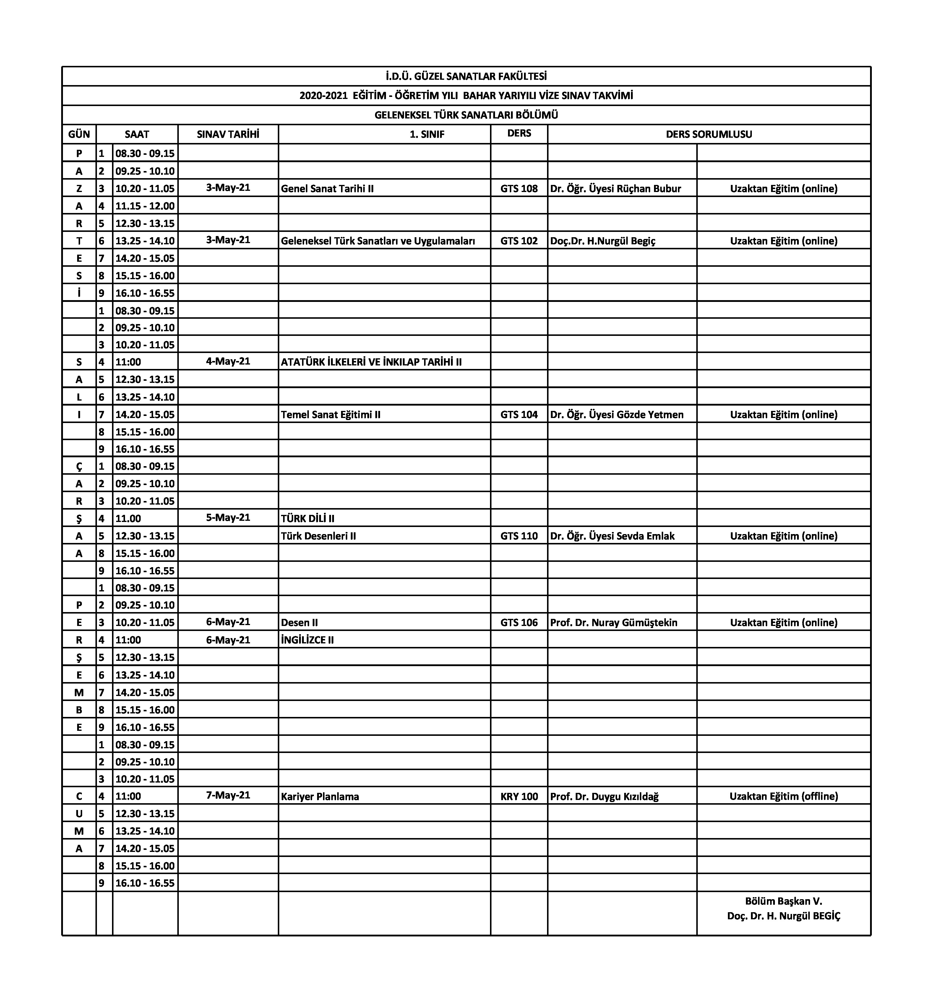 Geleneksel Türk Sanatları Bölümü 2020-2021 Bahar Yarıyılı Ara Sınav Tarihleri
