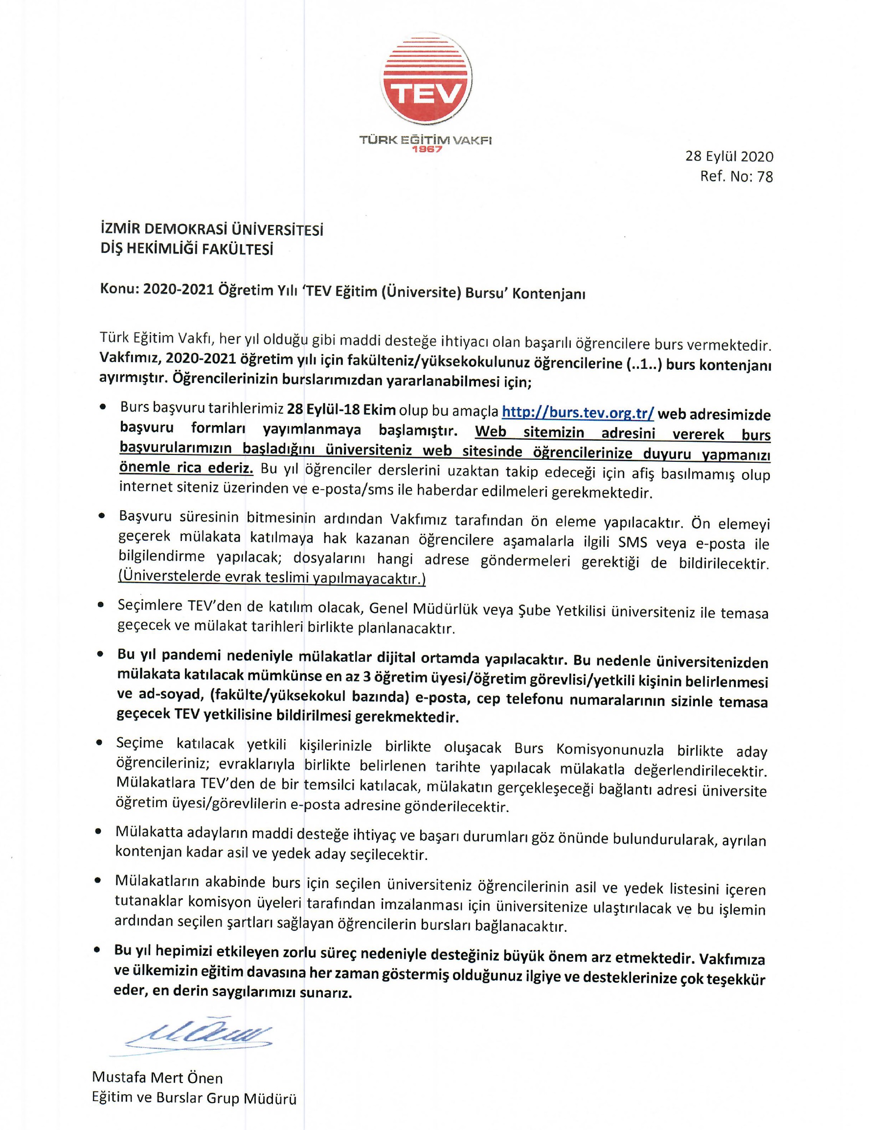 2020-2021 Öğretim Yılı TEV Eğitim Bursu